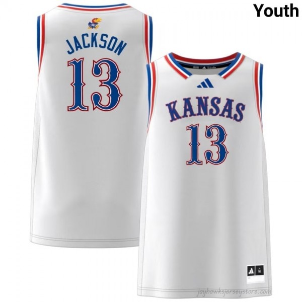 • University of Kansas White Elmarko Jackson #13 Basketball Jersey - Genuine Youth NCAA Hoops Stitched 97612721 - the ultimate piece of Jayhawk gear for fans who live and breathe crimson and blue. This isn't just a jersey, it's a wearable tribute to Kansas' unrivaled hoops heritage and the next star carrying that legacy forward.